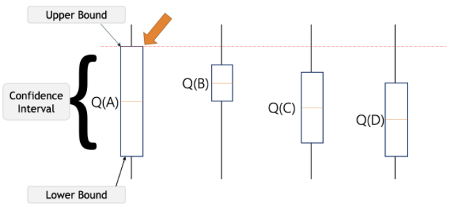 반면에 Action a가 b/c/d와 같이 다른 Action이 선택될 대마다 분자의 시간 t는 증가하지만 Action a가 선택된 횟수는 동일하므로 그 신뢰수준은 낮아질 것이다.